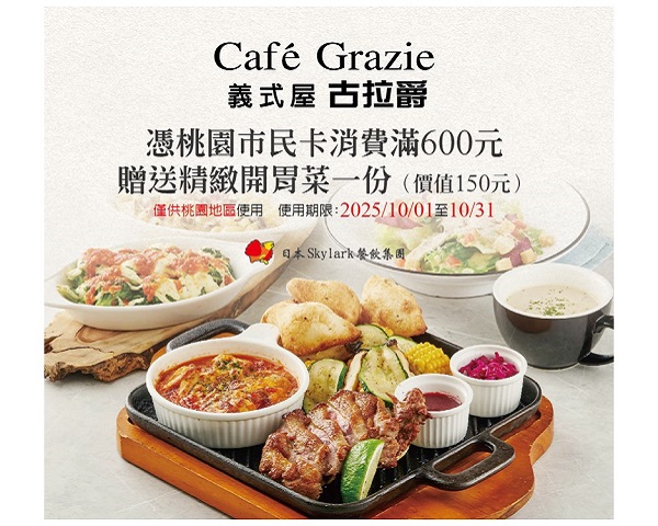 憑桃園市民卡或桃園數位碼消費滿600元,贈送精緻開胃菜一份(價值150元)