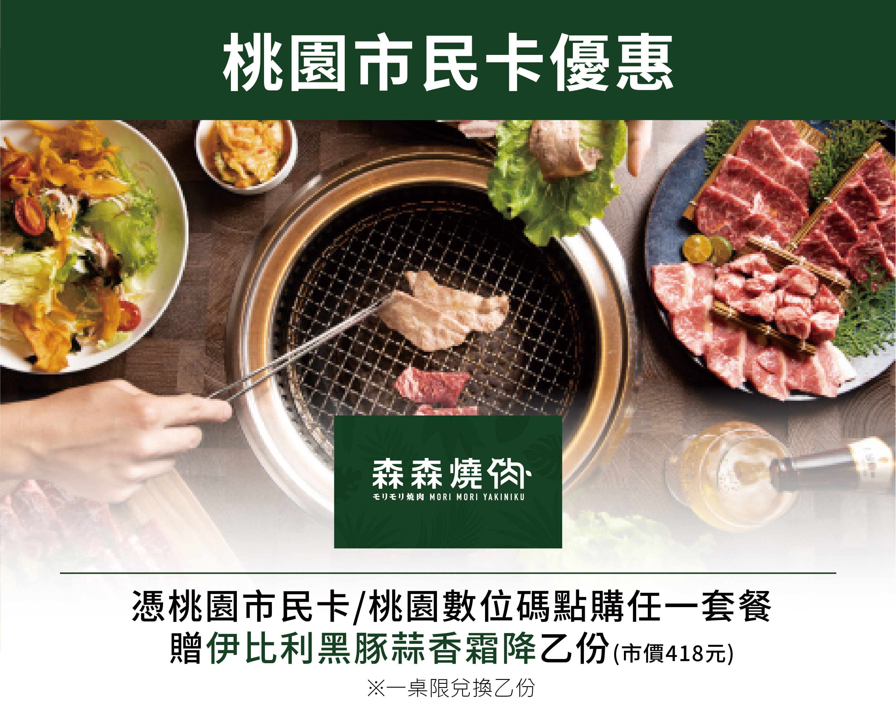 點購任一套餐,贈「伊比利黑豚蒜香霜降」乙份 (市價418元) (一桌限兌換乙份)。