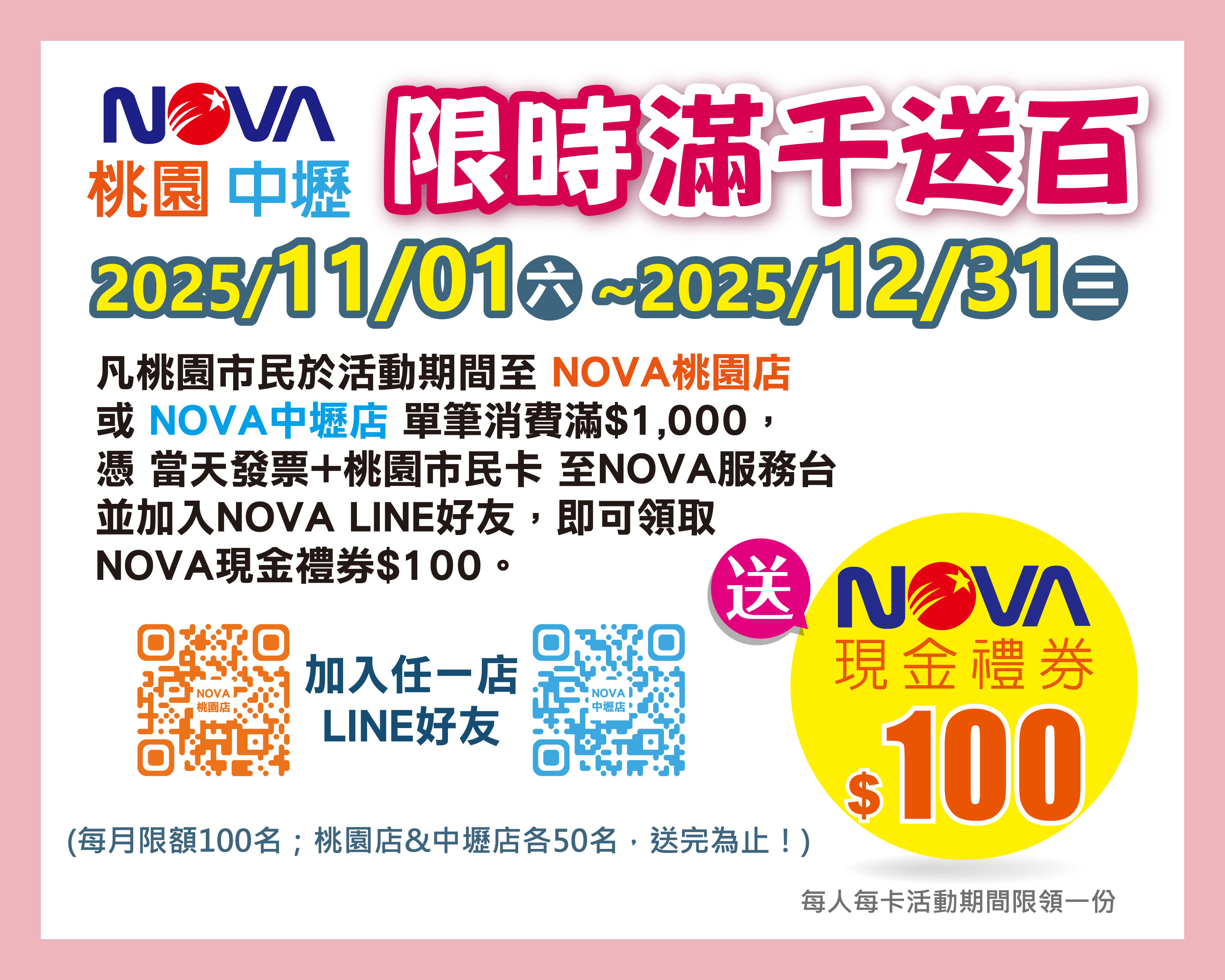 凡桃園市民於活動期間至NOVA桃園店或NOVA中壢店單筆消費滿$1,000,憑當天發票+桃園市民卡或桃園數位碼至NOVA服務台,並加入NOVA LINE好友,即可領取NOVA現金禮券$100。